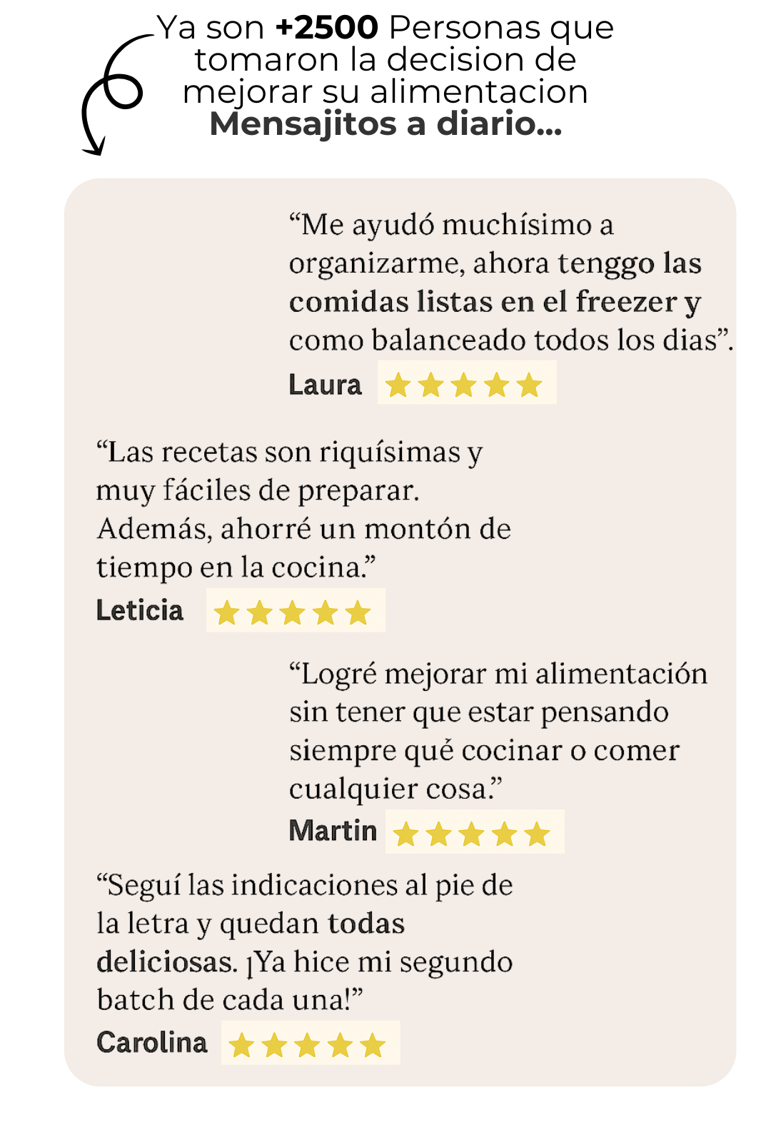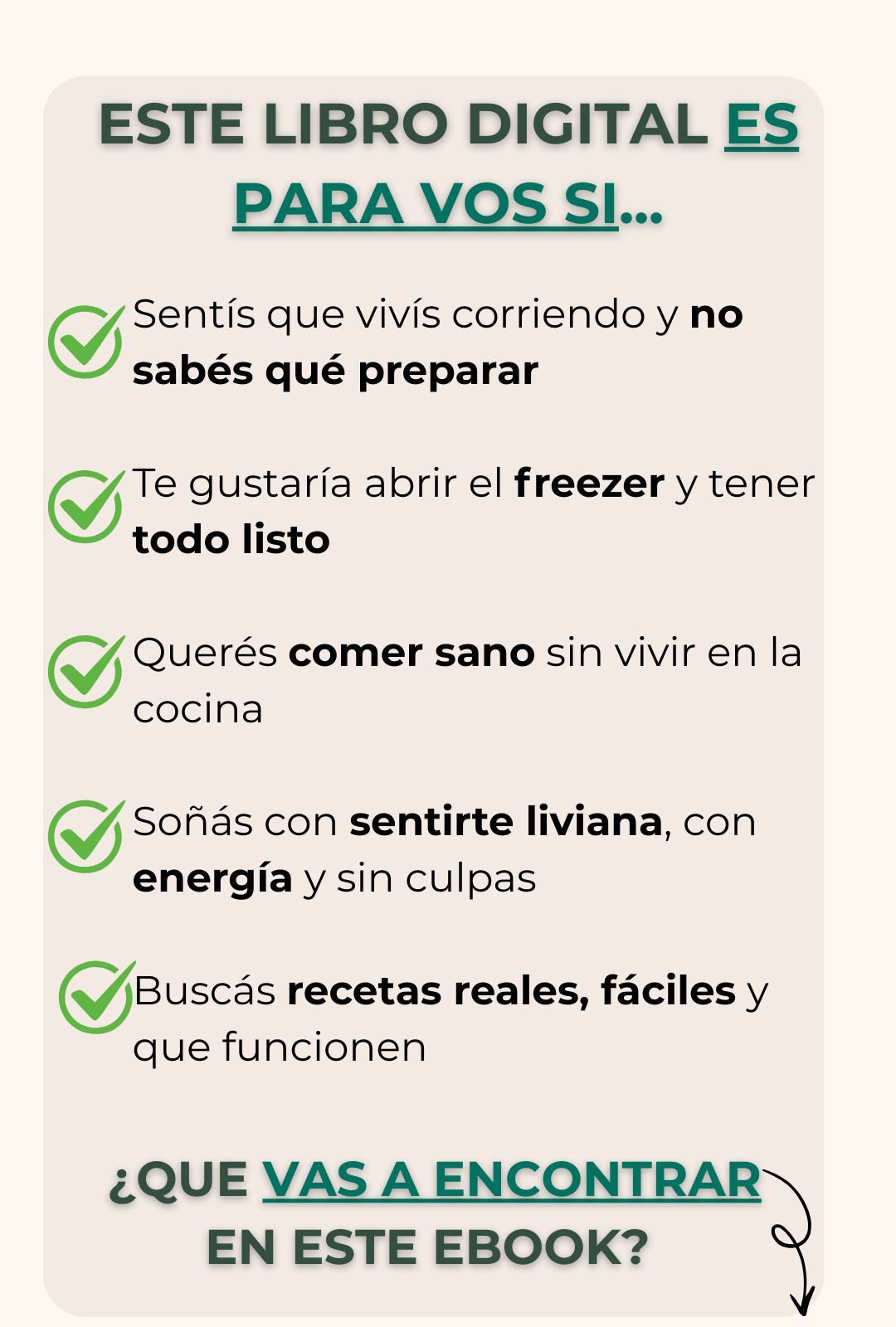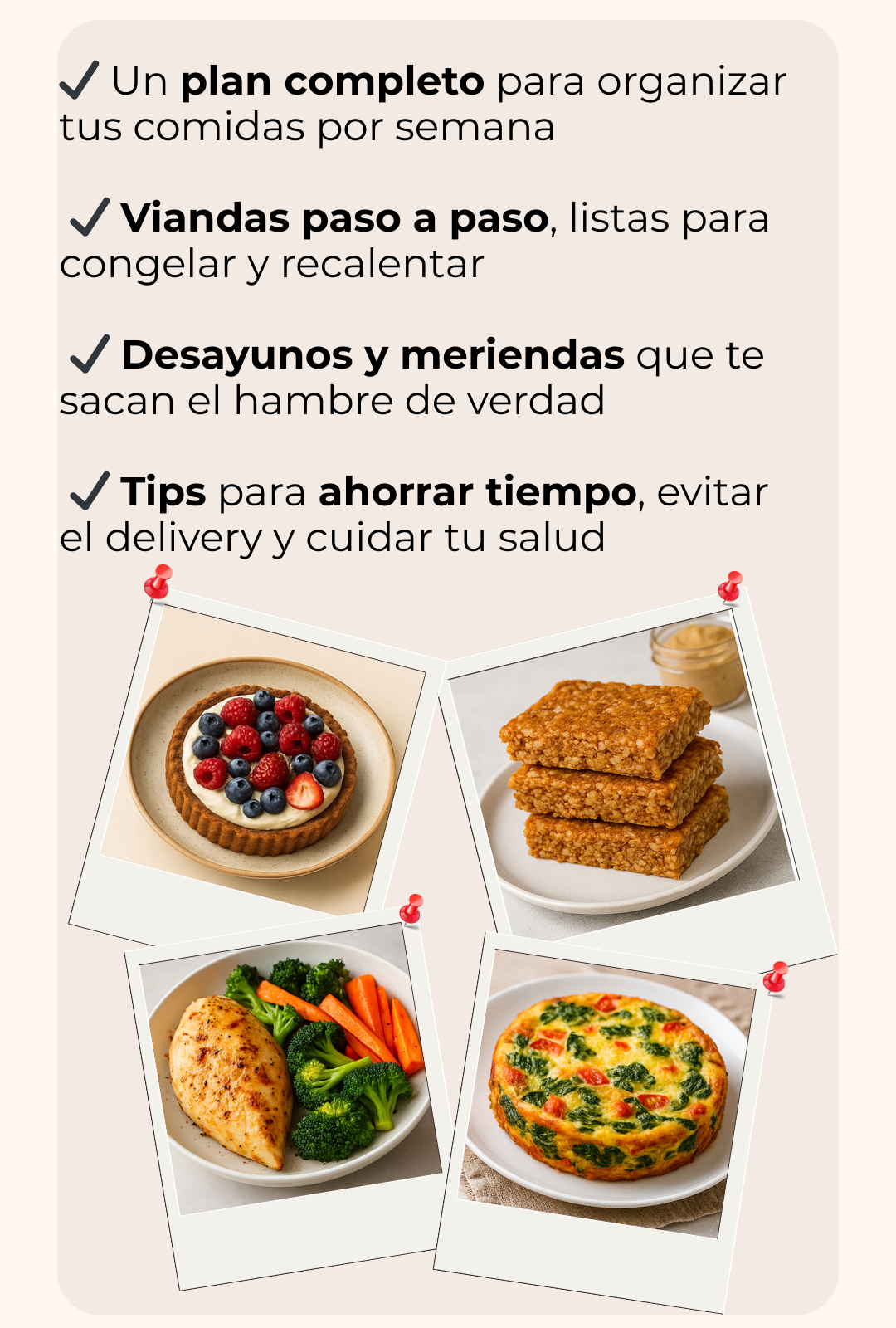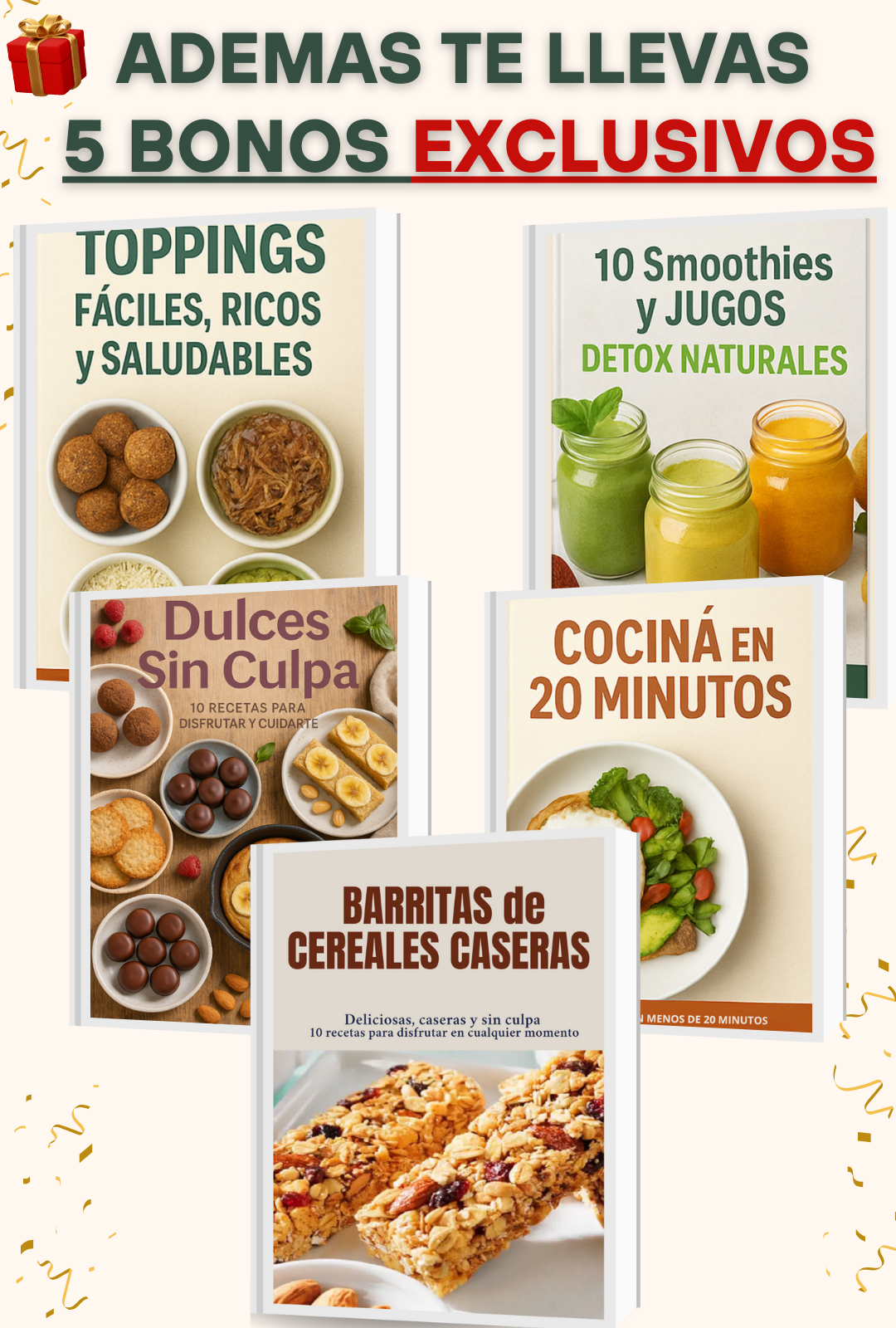 Vs a recibir un ebook con plan completo para organizar tus comidas por semana, cenas y almuerzos listos para frezar, ademas de desayunos y meriendas super faciles de realizar, paso a paso saludables + 5 BONOS exclusivos